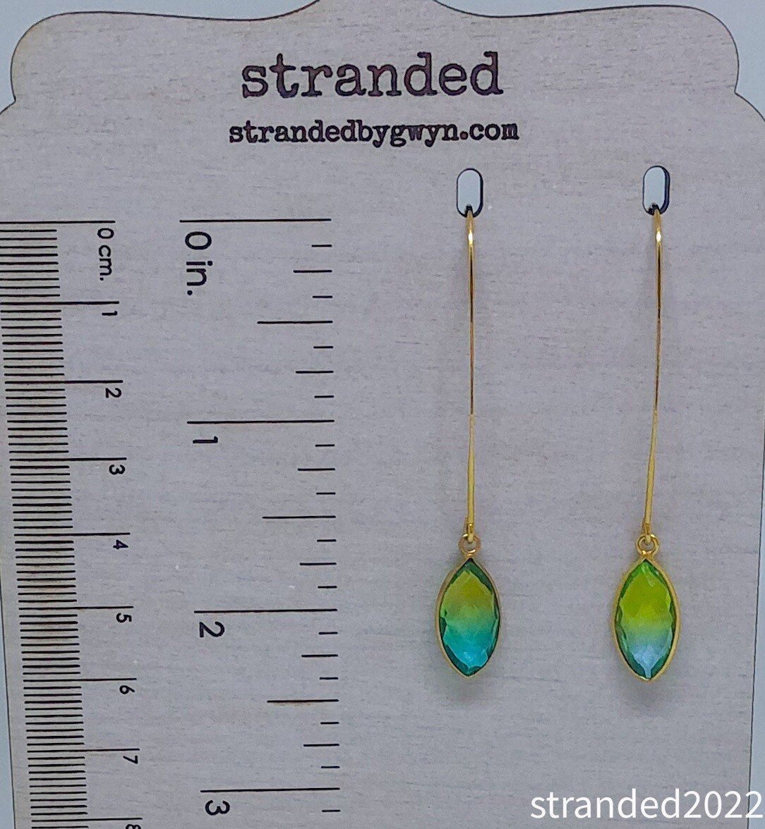 Tranquil Drop Earrings $24.00 Only 1 available Beautiful treated quartz with a blue/green ombré look. Paired with a dramatic two- inch ear hook. 2.25 inches. High quality gold plate.
